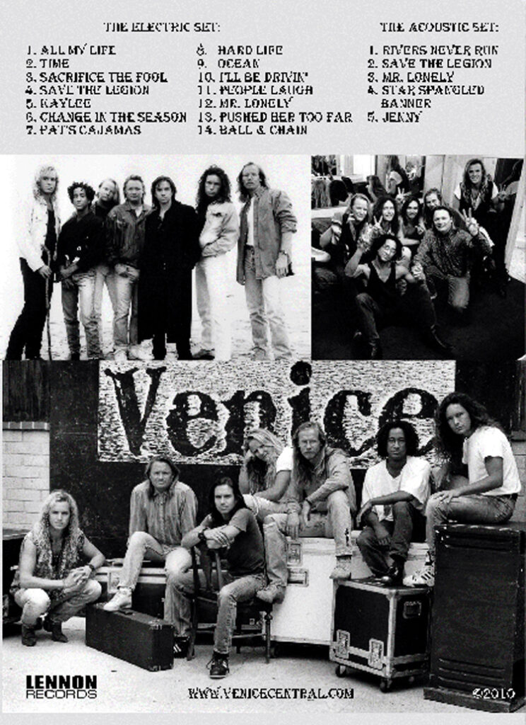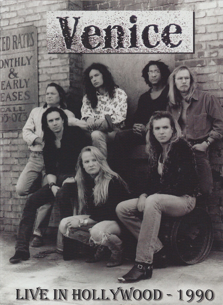 Back in March of 1990, Venice had just finished recording our major label debut album with the classic 7-member lineup that we now refer to as “The Magnificent Seven.” This lineup featured longtime Venice legend and fan favorite Mark Harris on the bass, drummer Scott Crago, who later became a permanent touring and recording member of The Eagles, and keyboardist Monroe Jones, who is now a Grammy-winning record producer working out of Nashville. This was an era of longer hair and a bigger rock sound, but even then, we had our signature harmonies. It was a golden time for us. We were selling out LA clubs like the Troubadour, the Roxy and the Whisky, and we were just starting to tour the US. We also played a few concerts at a music school in Hollywood, CA, which were filmed, recorded and attended by career-minded musicians (more “listeners” than “party-ers”, hence their subdued response). Highlights from those shows make up this DVD. Because the masters were stored in a vault for 20 years, the video and audio quality isn’t always up to the high standards we like to maintain on new releases. But despite the occasional hiss and crackle, it offers a rare glimpse back to an earlier era of the band. And it’s a lot of fun. Yeah, so maybe the pants are a little high-waisted. It was hip at the time…